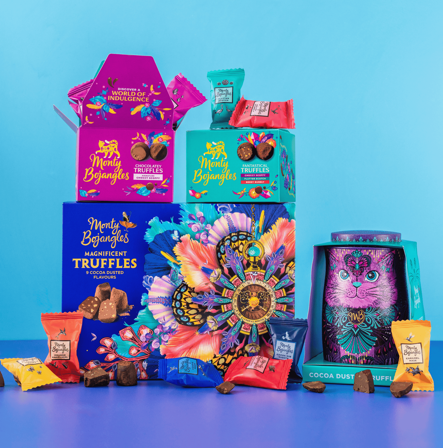 Our mission is to deliver irresistibly delicious treats that ignite the senses and transport you to a world of pure indulgence. With a wide range of beautifully designed gift boxes, sharing packs, and chocolate bars, Monty Bojangles brings together unique flavours, textures, and creativity to make every chocolate moment a celebration of pure, enjoyment.