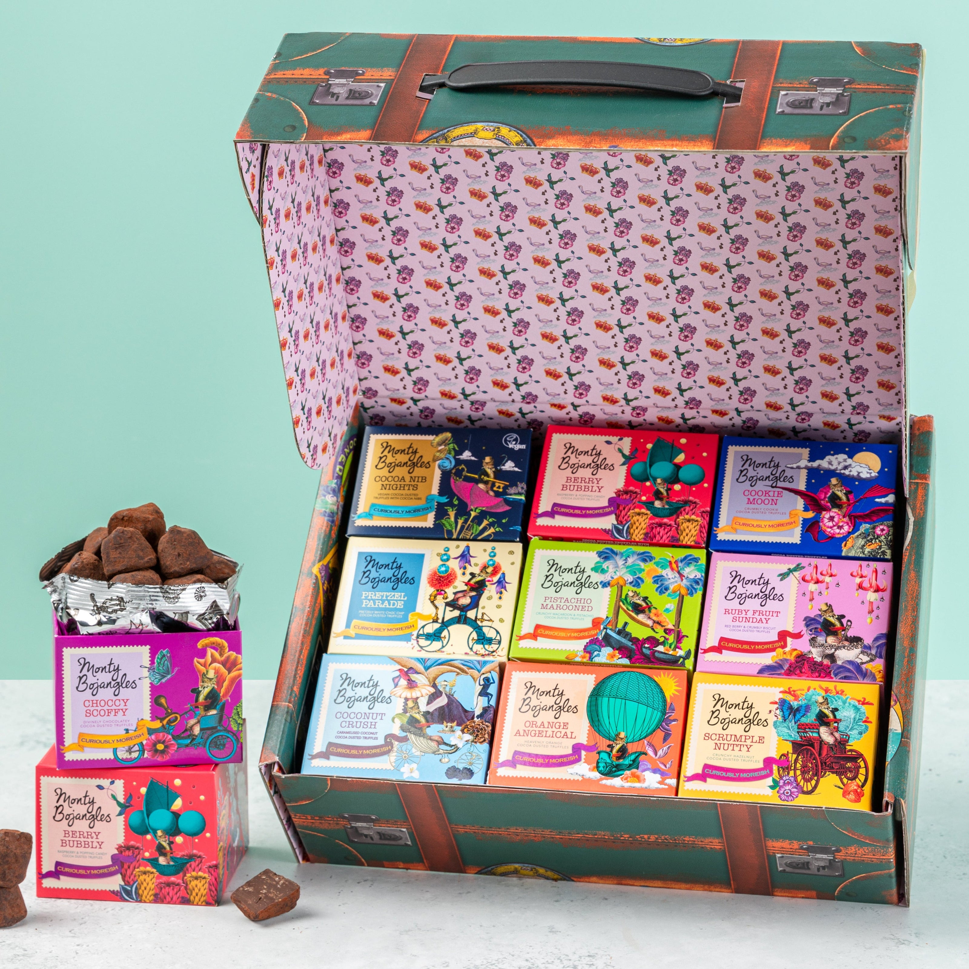 A collection of intensely chocolatey cocoa dusted truffles to be discovered within a beautiful truffle trunk. Makes for a substantial & indulgent luxury present for chocoholics.
